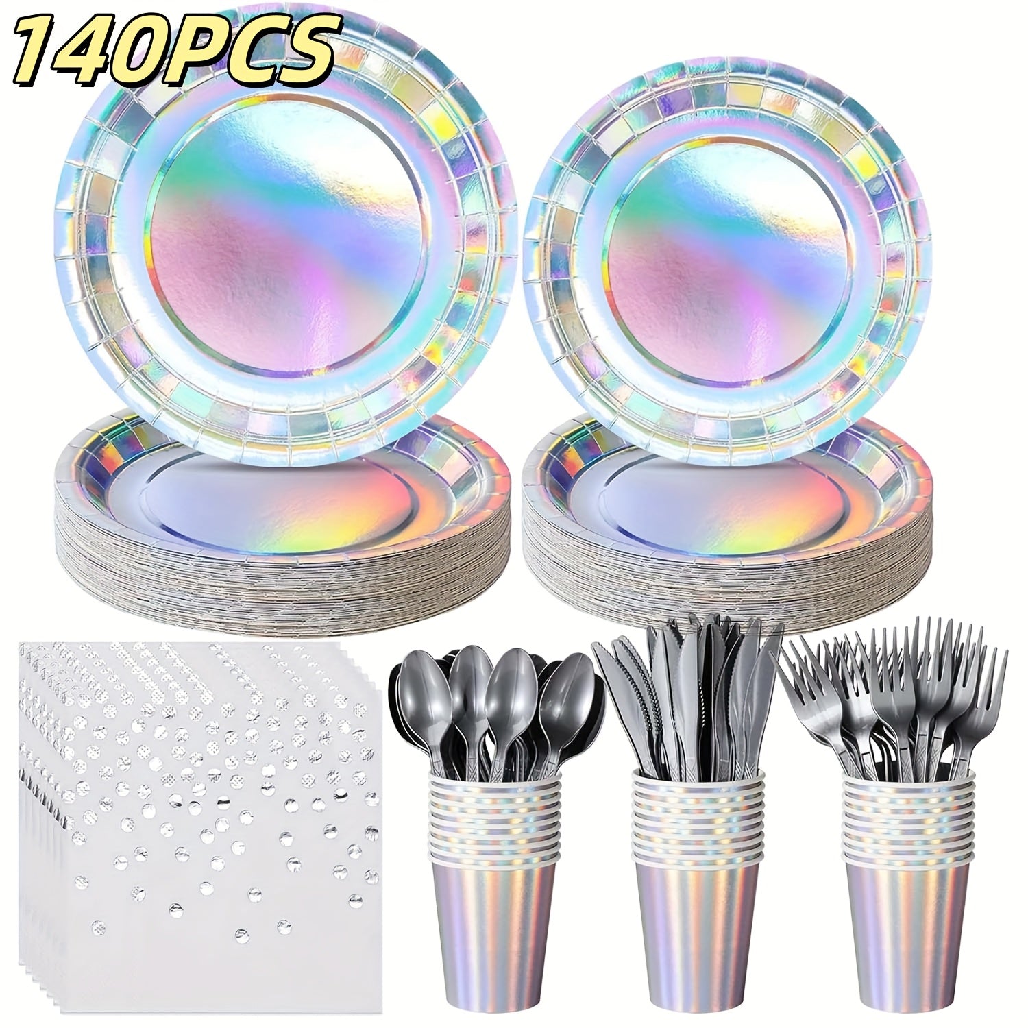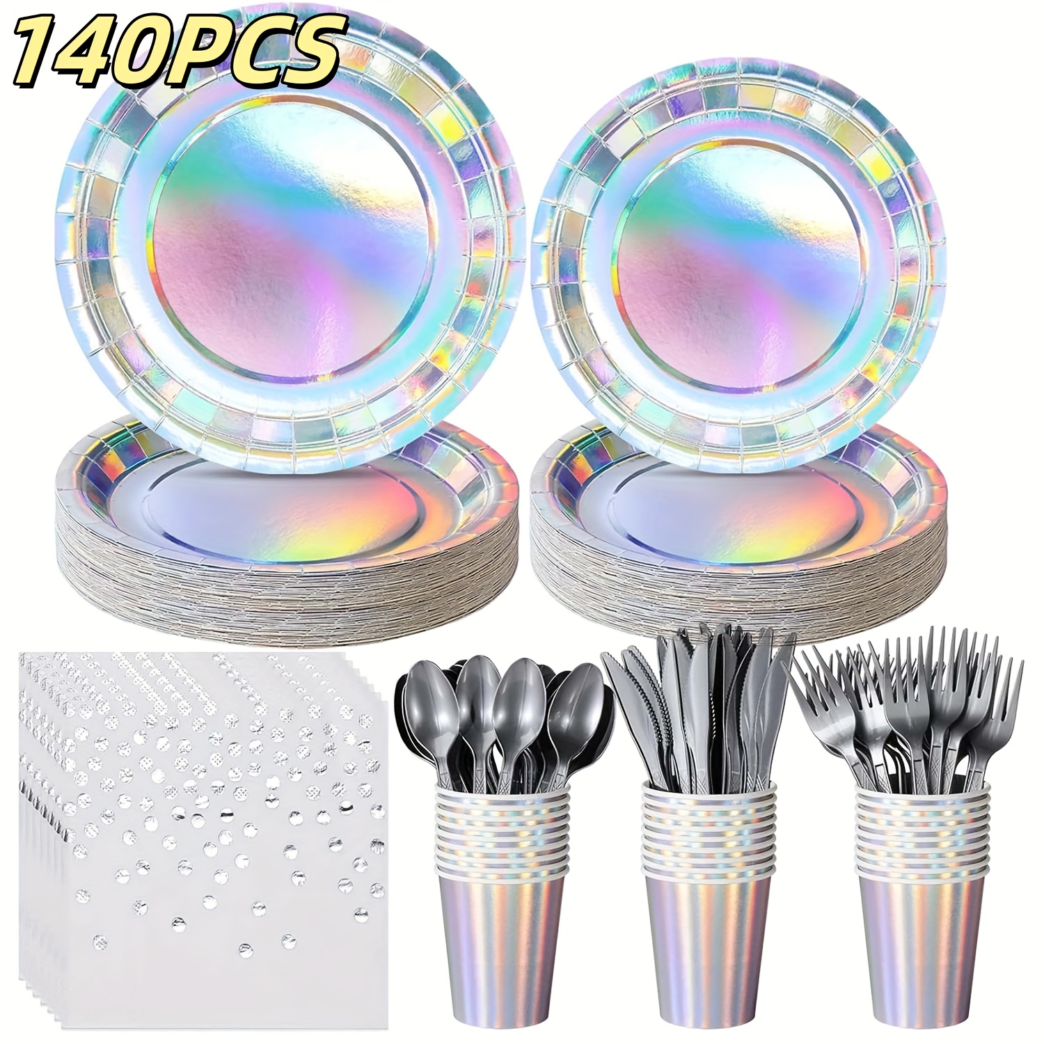 140 Pieces Holographic Iridescent Party Supplies Complete Set for 20 Guests Disposable Plates Cups Napkins Cutlery