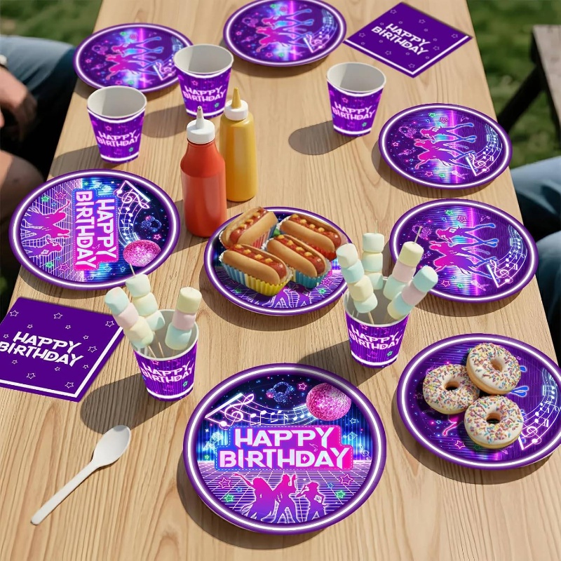 168 pieces of Kpop-themed birthday party supplies including plates, napkins, cups, knives, forks, and spoons, suitable for serving 24 guests.