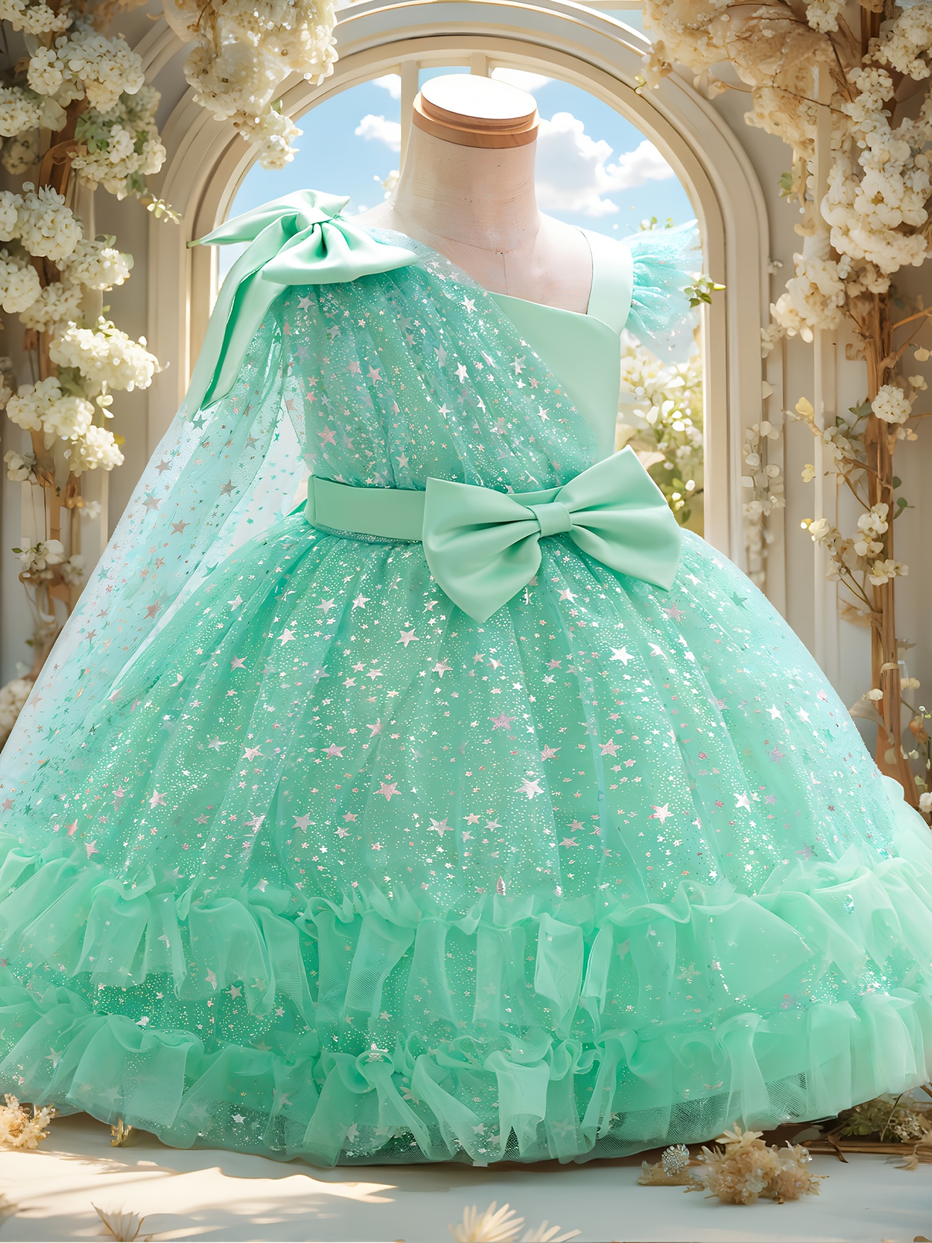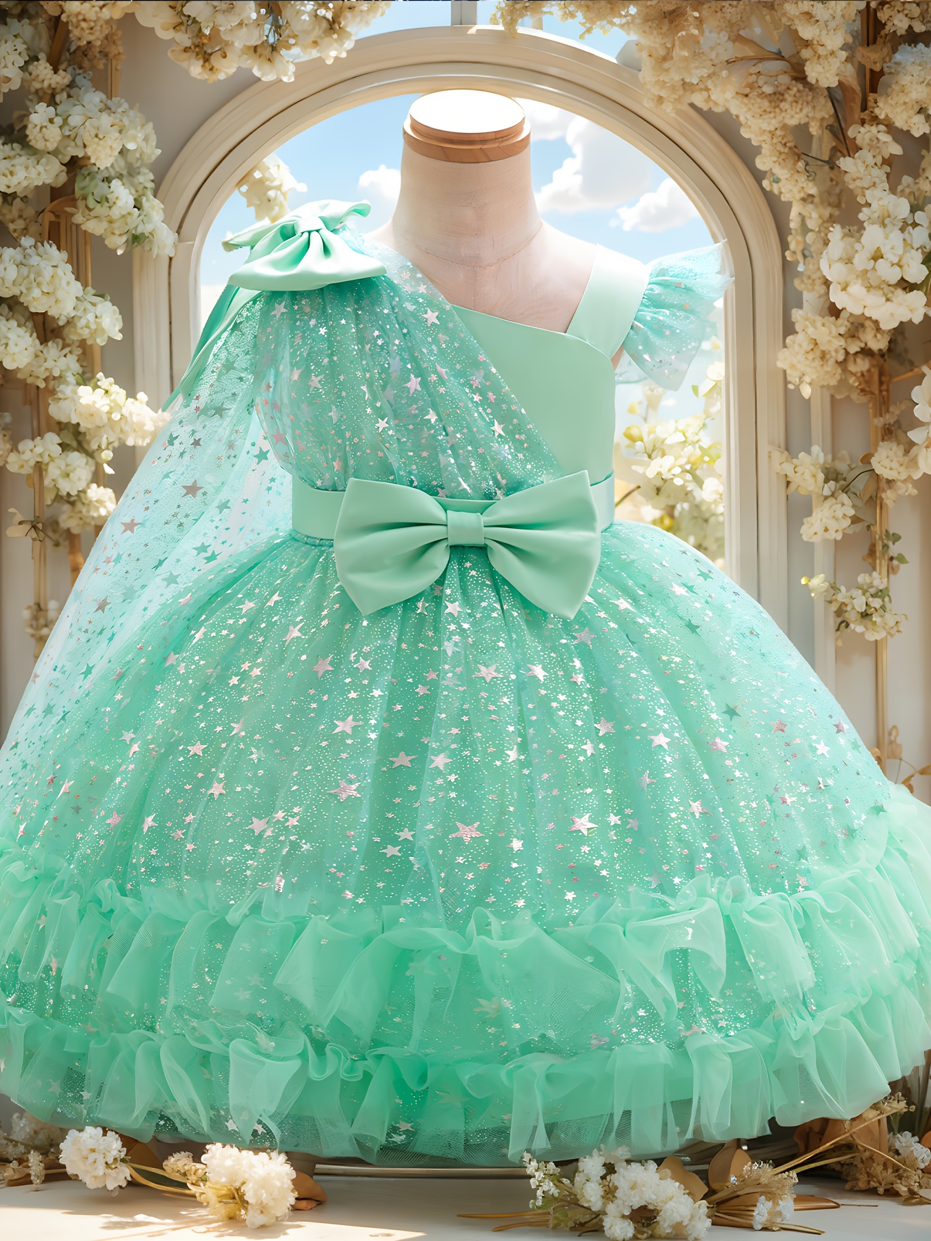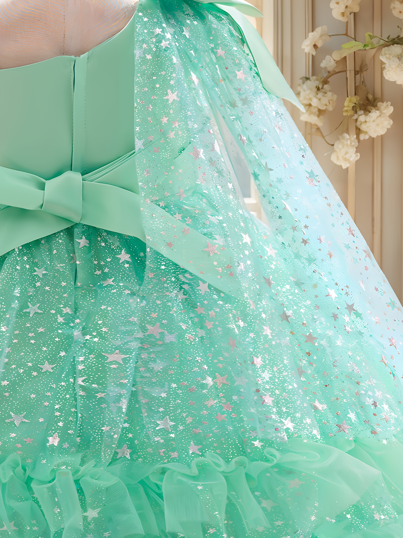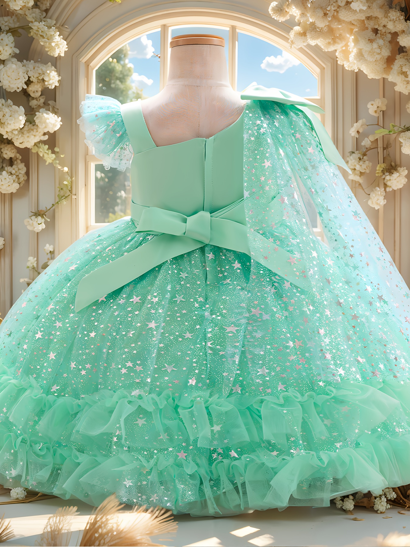 1st Birthday Girl Dress with Detachable Cape & Starry Tutu - Mint Green Sparkling Princess Party Gown, Soft Breathable Baby Girl for Weddings, Photo Shoots & Celebration Outfit (Short Sleeves, Belt)