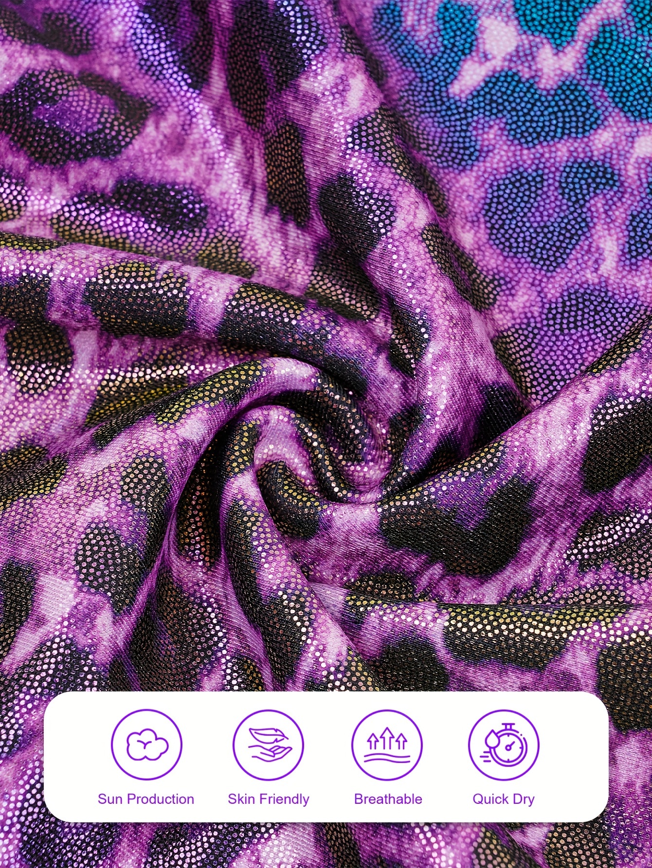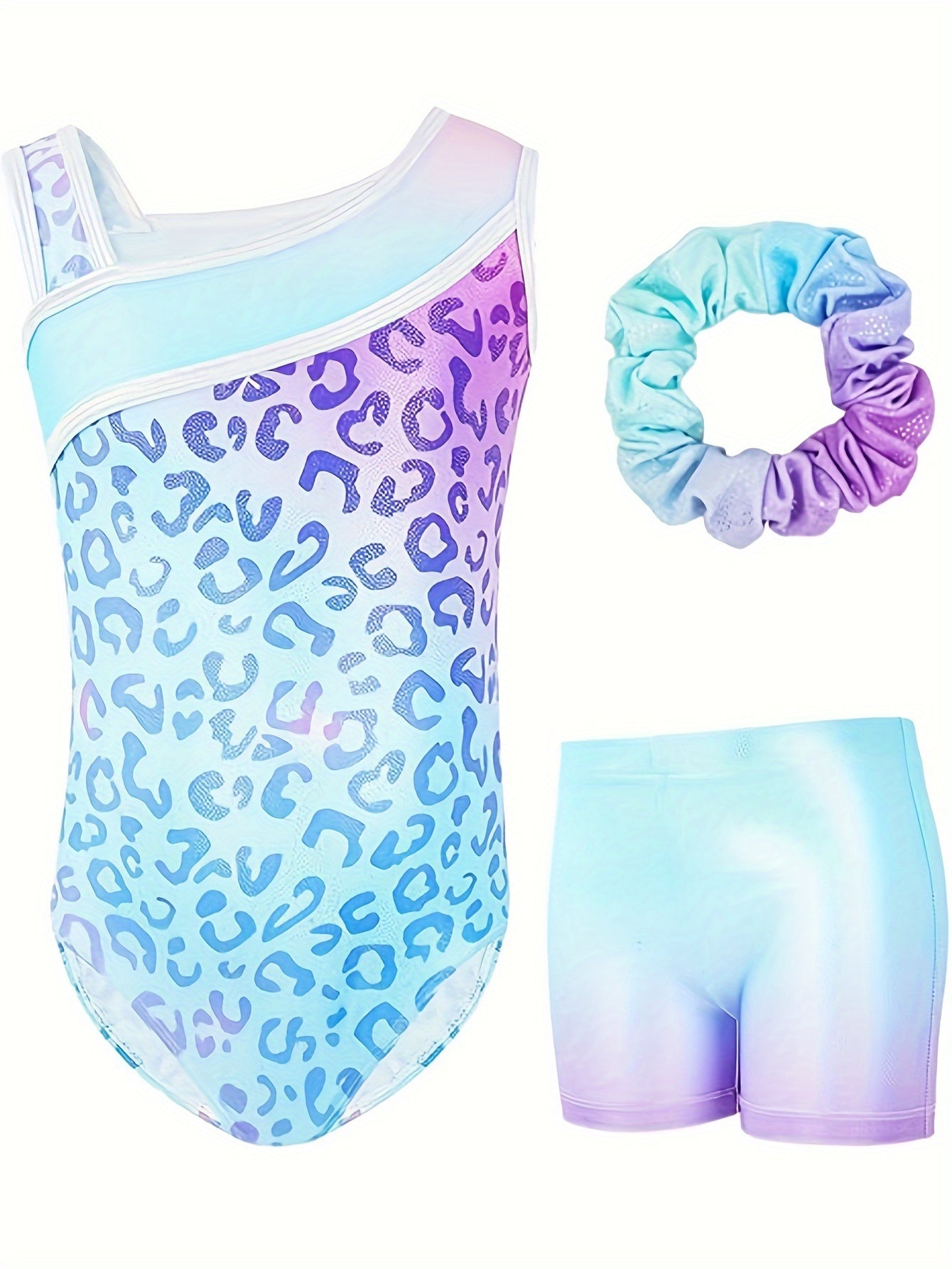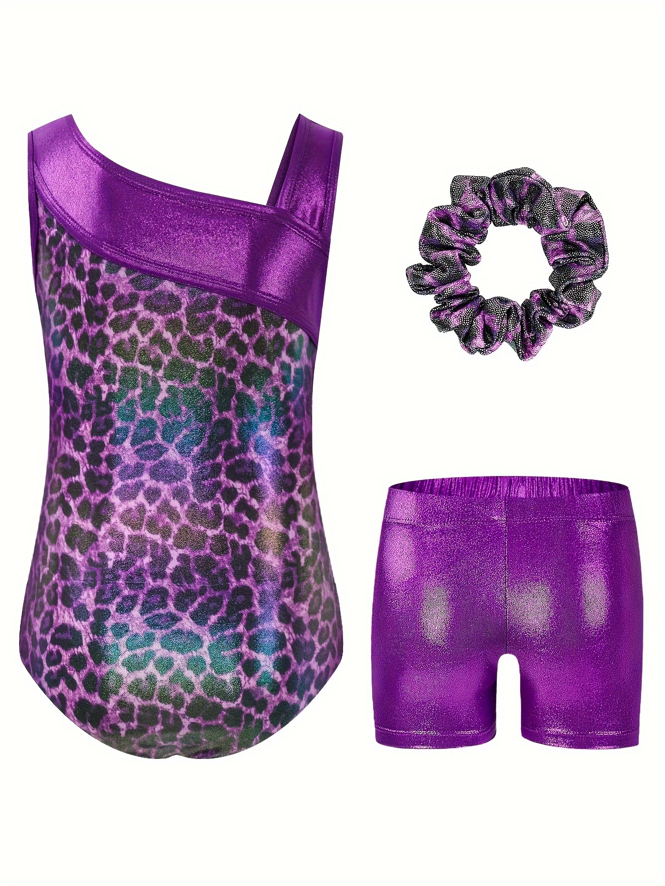 3pcs Girls' Slim & Fit Gymnastics Outfit - Leopard Print One-Shoulder Leotard, Vibrant Purple Shorts & Matching Hairband for Dancing & Sports, Gymnastics Attire|Vibrant Gymwear|Stretchy Fabric, for Outdoor