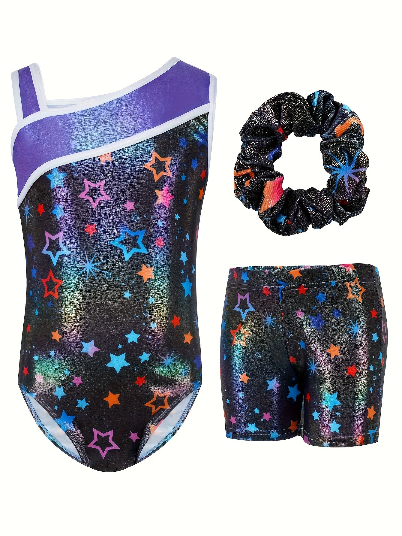 3pcs Gymnastics Leotards for Girls, Youngsters Sleeveless Y-neck Glitter Stars Dance Unitards Biketards with Shorts + Hair Scrunchies Purple, Cute Gymnastics Outfits for Girl, for Outdoor, Perfect for Outdoor