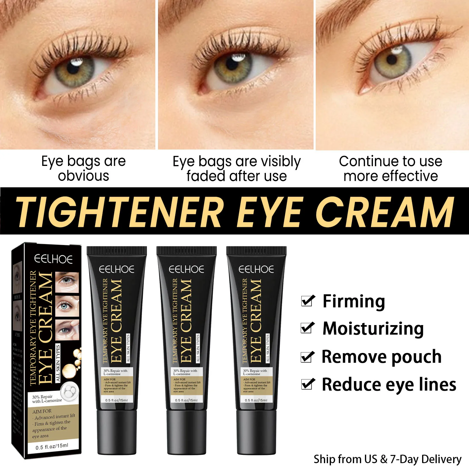 Quickly remove eye bags after use, tighten delicate skin around the eyes, smooth crow's feet, fade dark circles, puffiness, and fine lines, making your eyes more beautiful.