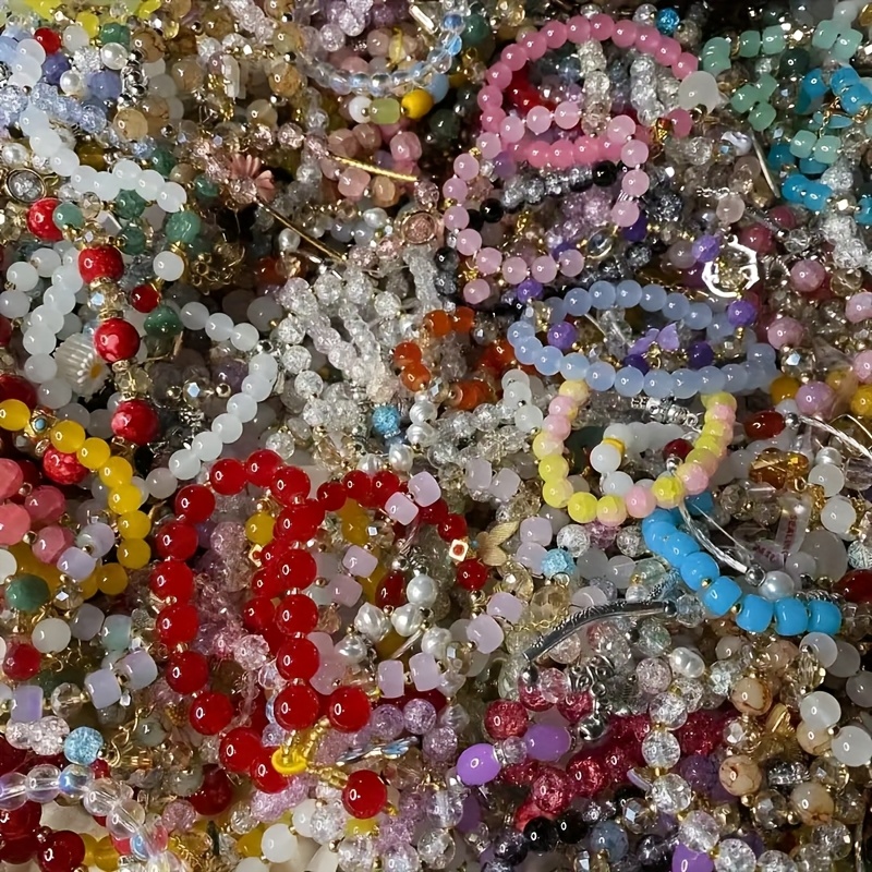 - A versatile 90-piece set of glass-bead, elastic bracelets that work for both men and women.