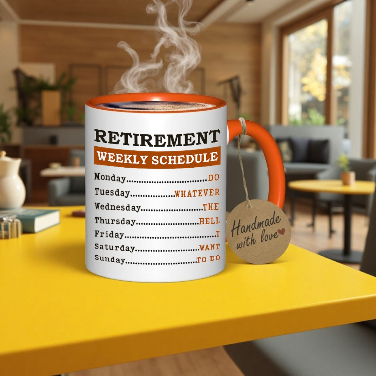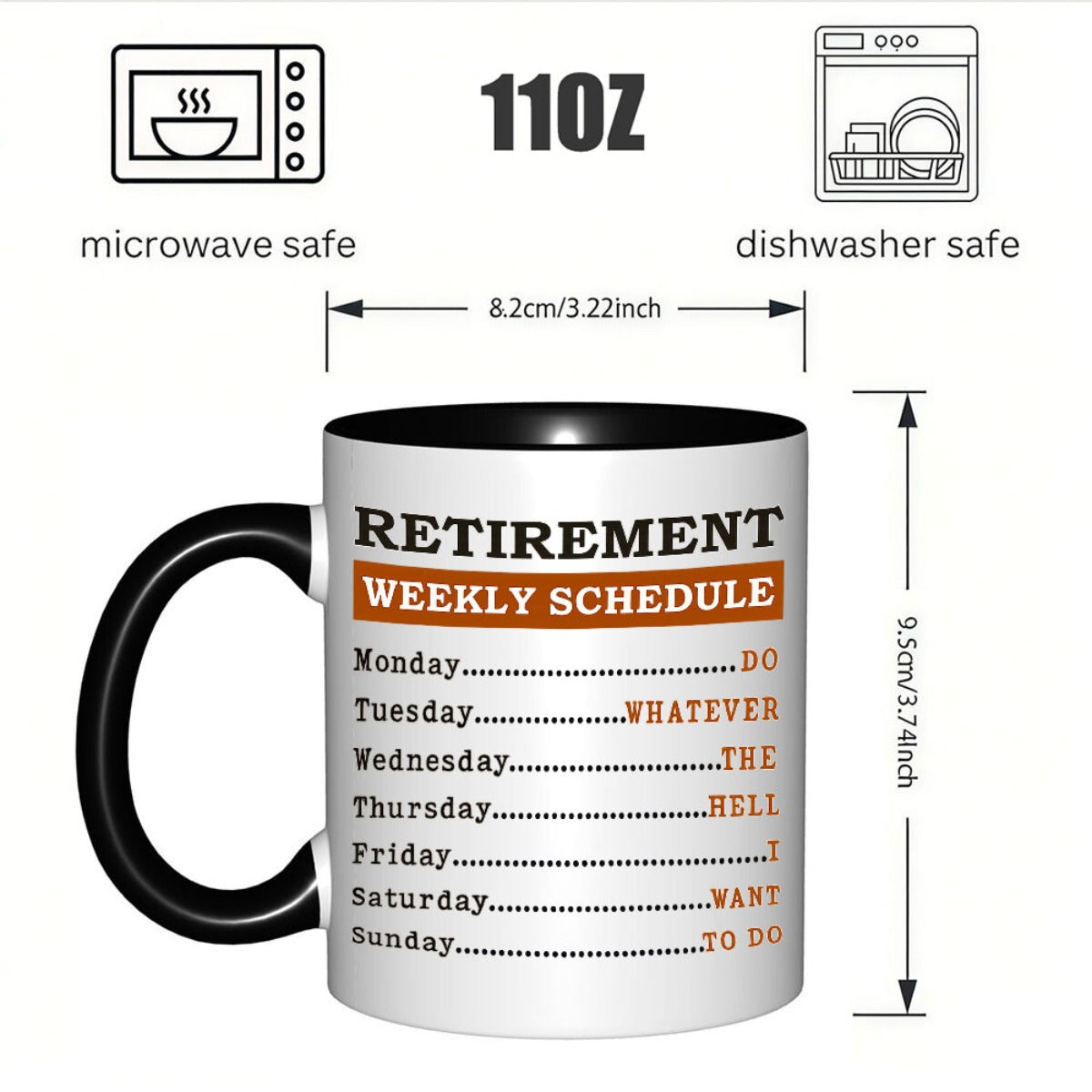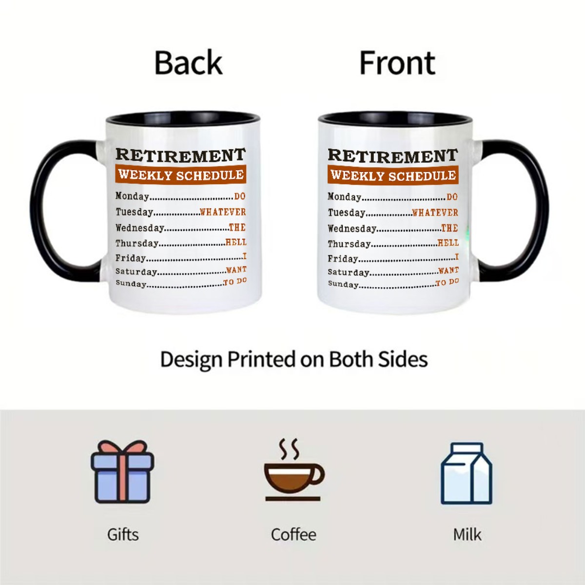 A humorous 11oz ceramic coffee mug with a weekly schedule design designed for daily use at home, in the office, or as a thoughtful retirement gift. This versatile mug pairs a playful planner motif with reliable ceramic construction, making it more than just a container for your beverage — it’s a little productivity tool with personality.