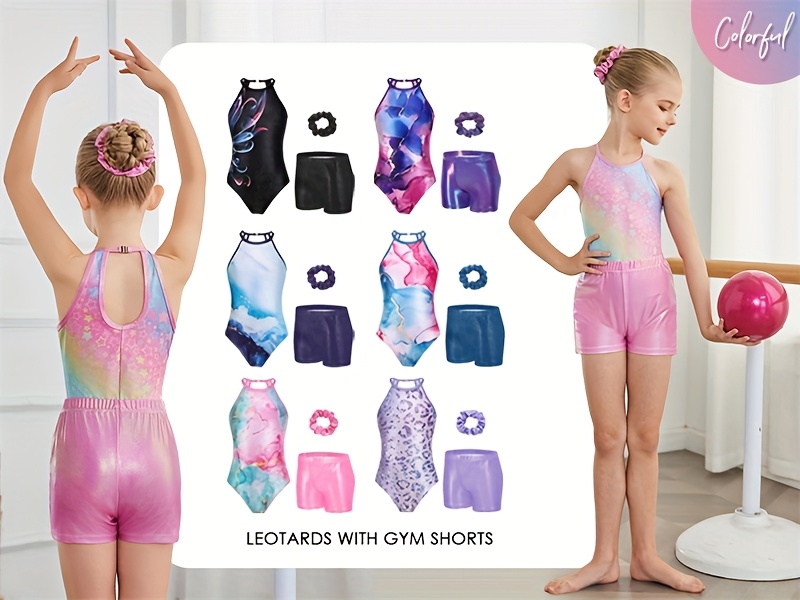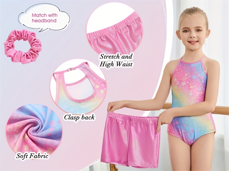 The girls' dance attire is appropriate for gymnastics, ballet, yoga, swimming, tumbling, skating, cheerleading events, and competitions.