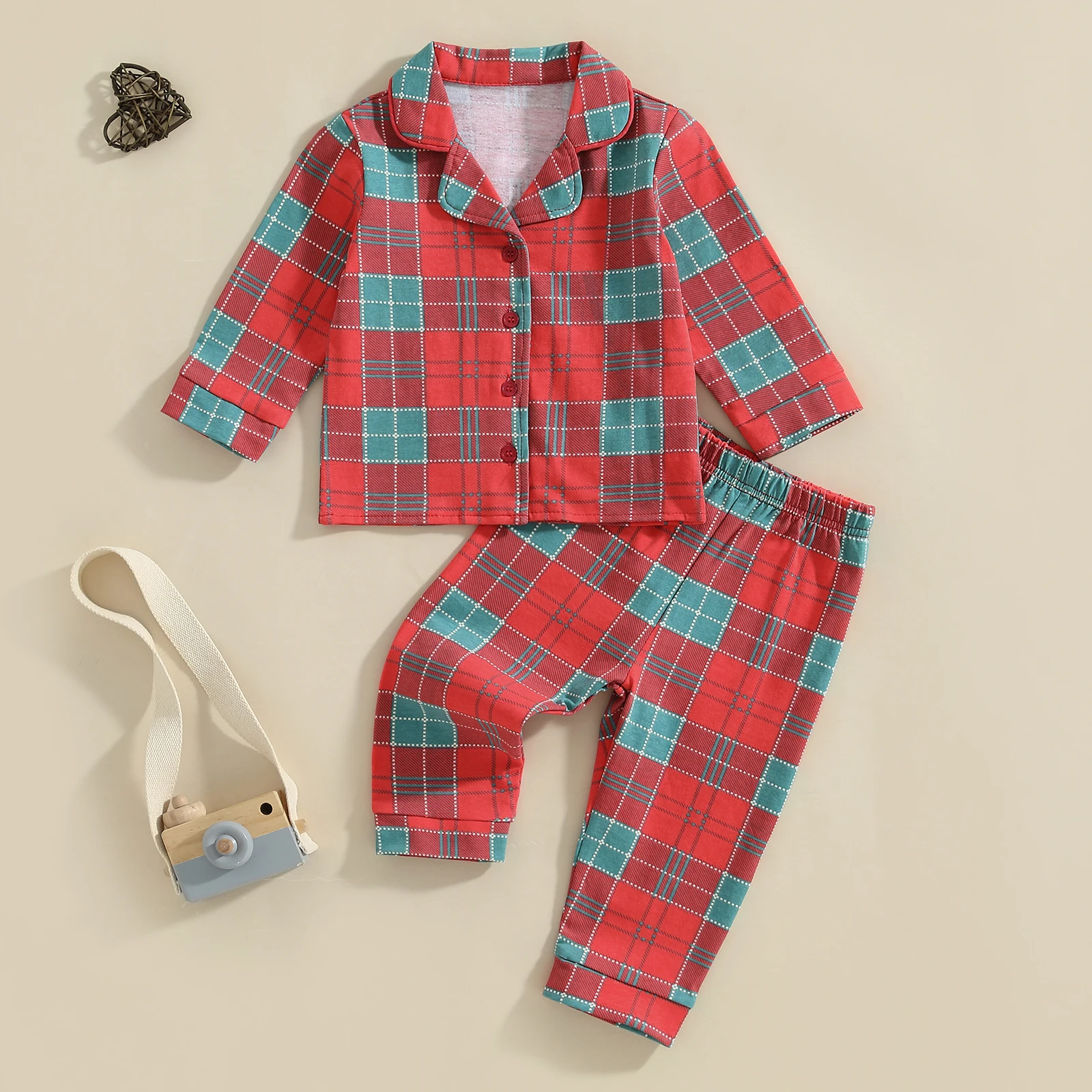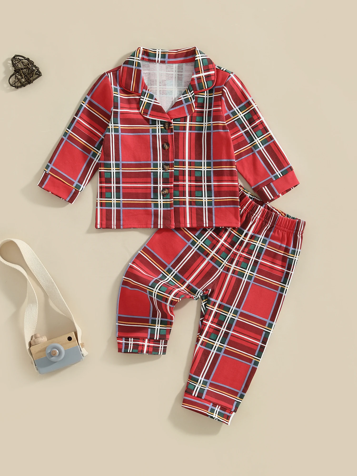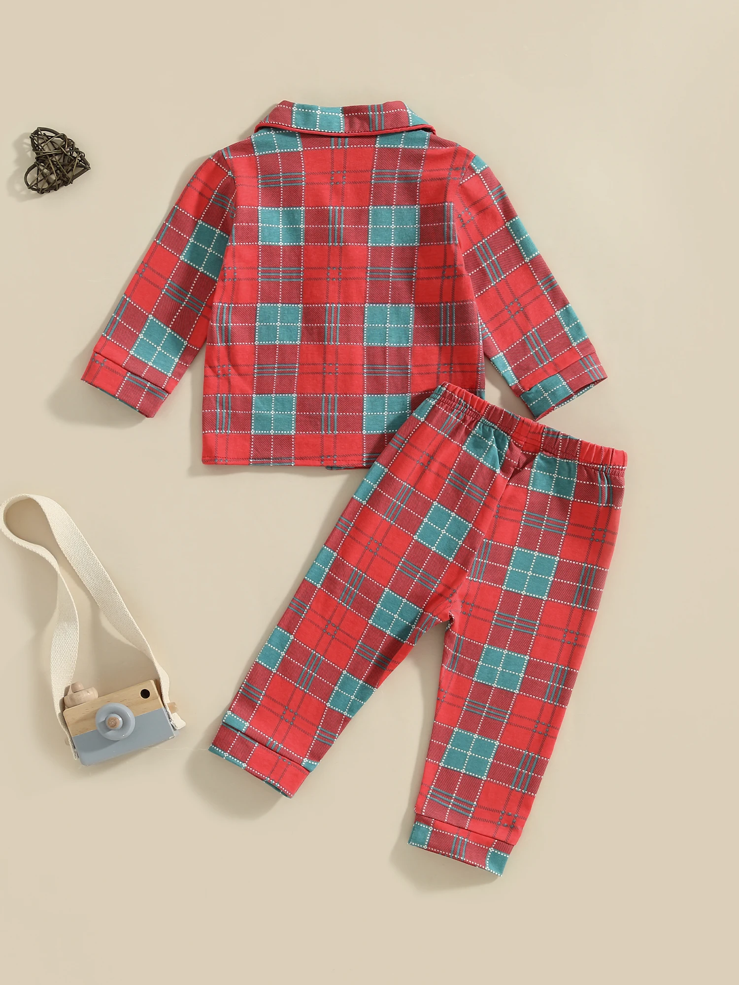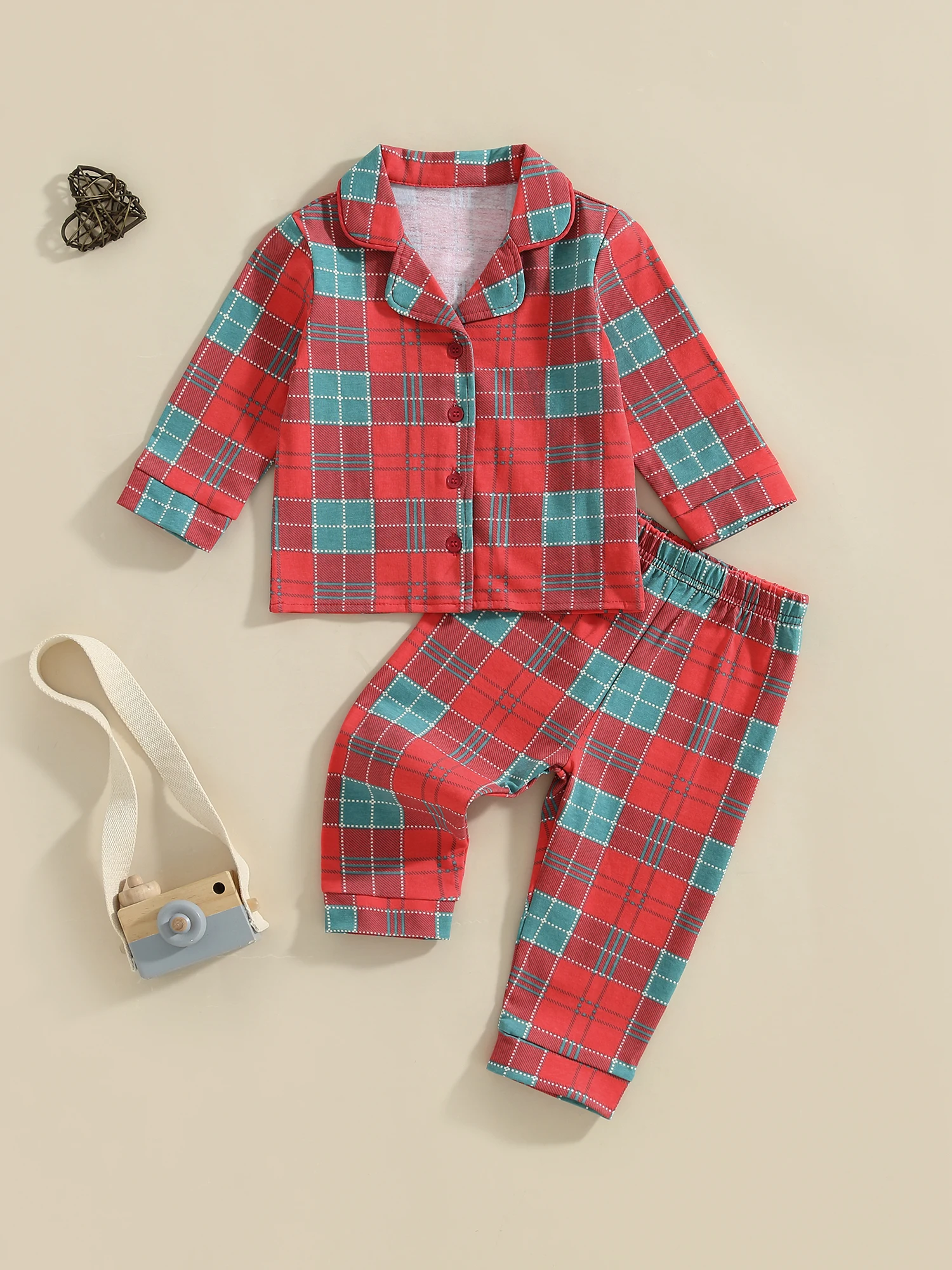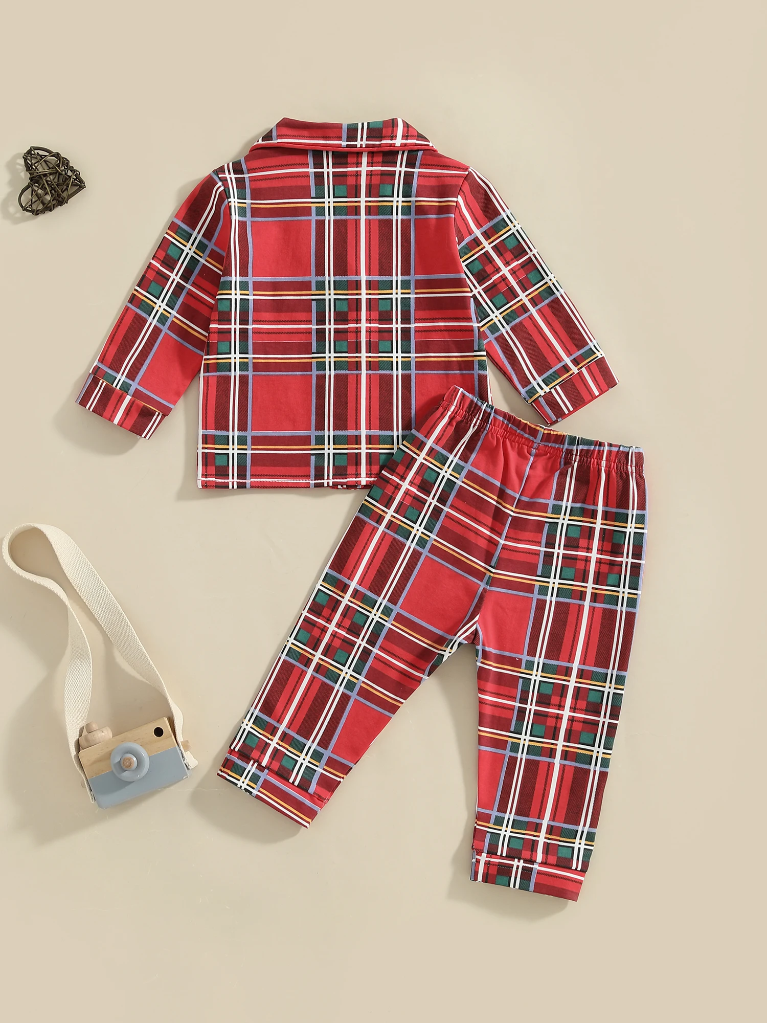 Child Autumn Checkered Pattern Pajama Set With Long Sleeve Lapel Collar Button Down Top And Matching Pants For Cozy