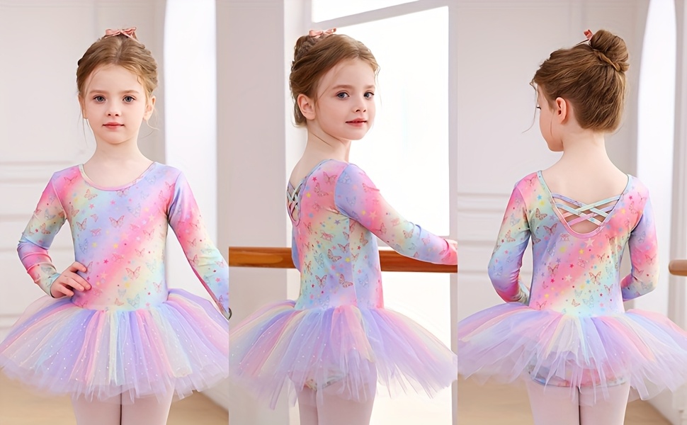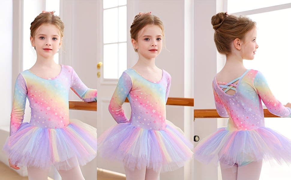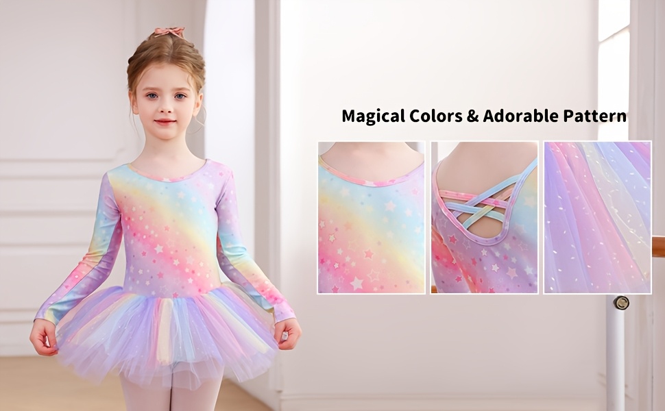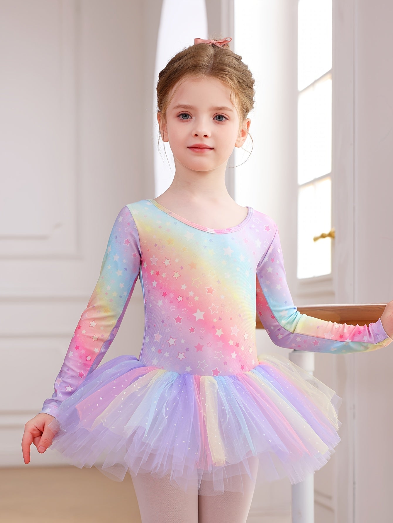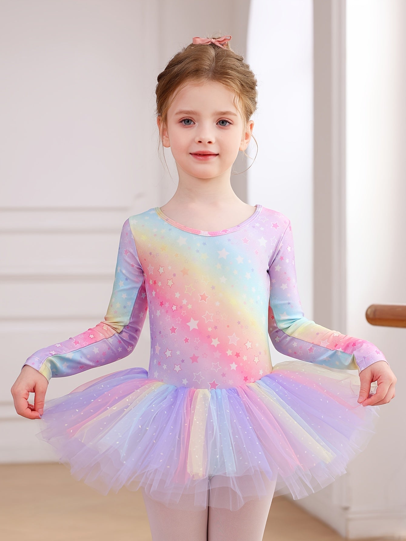 Christmas Gift Girls' Outfit - Long Sleeve Star Rainbow Butterfly Print One-Piece Tulle Puffy Dress, Non-Detachable Fall Ballet Gymnastics Leotard For Daily Wear, Birthday Party, Dance Performance, Outdoor Sports