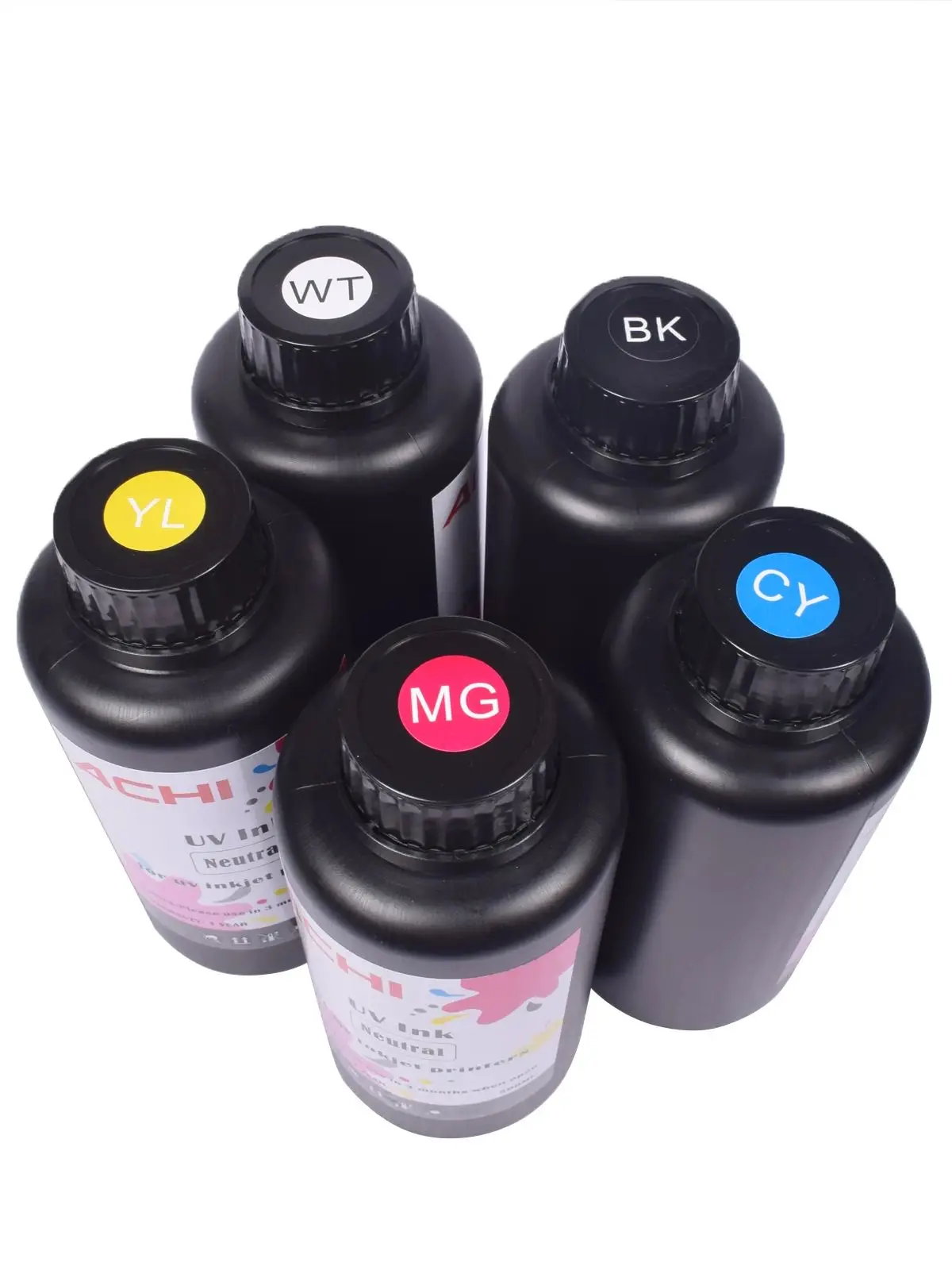 - Five 500ml bottles in Black, White, Blue, Yellow, and Magenta provide ready-to-use UV ink for extended runs and easy color management.