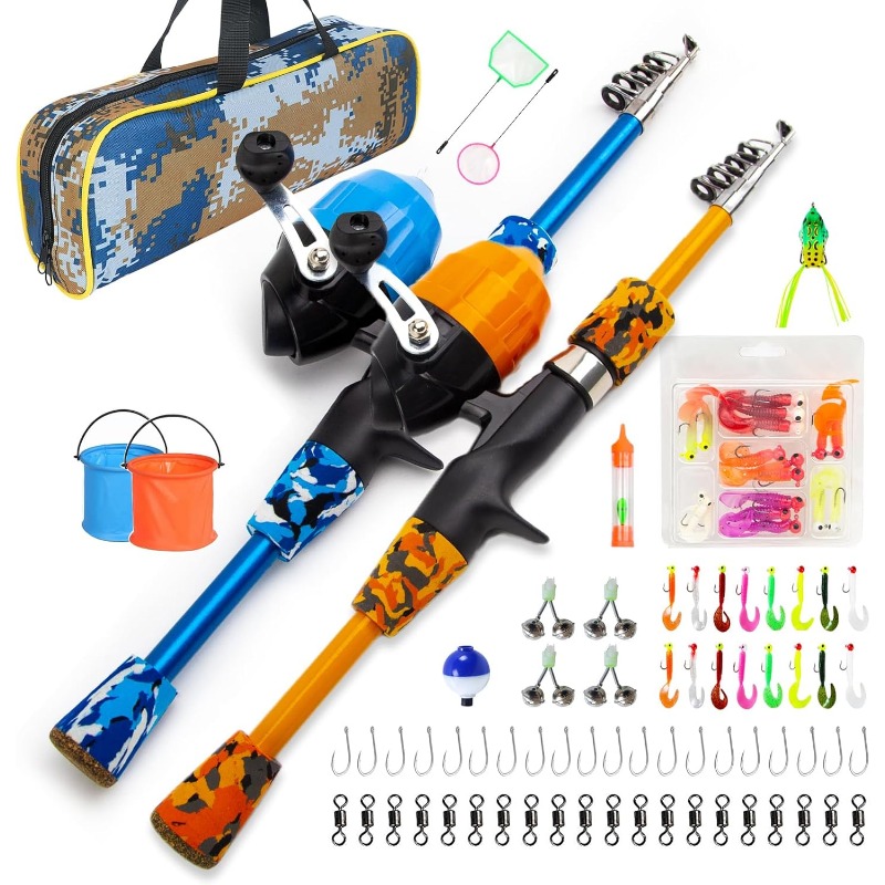 FISIHING ROD SET:A blue fishing rod and matching fishing reels, a set of soft baits including a variety of lures,, a collapsible bucket, a small fishing net, two types of fish drift, and hook swivels, bionic frogs and other accessories, suitable for a variety of different fishing environments, is a great fishing set for beginners. GREAT VALUE FISHING ROD: The rods are 4.9 inches long, portable and retractable, and are soft and flexible lightweight fishing rods for boys and girls ag
