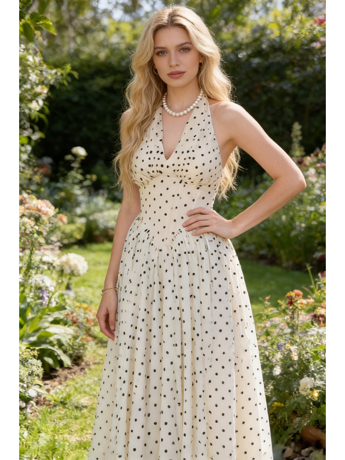 French Polka Dot V-neck Halter Dress | Pure and Seductive Waist-Controlled Big Swing Long Dress, Backless Slim-fit Fairy-like Skirt for Women, Elegant Style for Spring/Summer/Fall