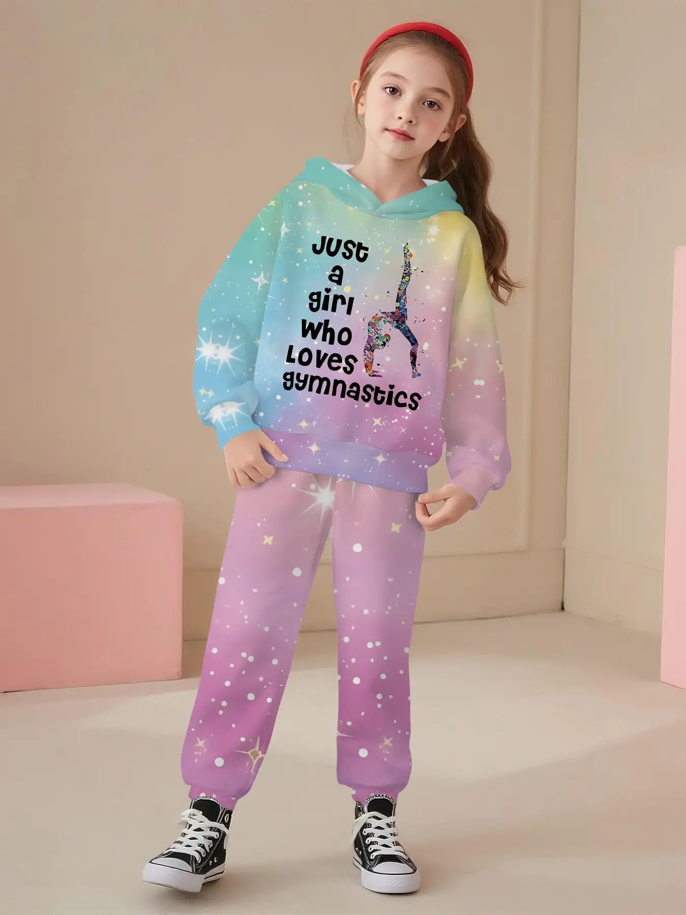 Girls' 2pcs Gymnastics-Themed Hoodie & Pants Set with 3D Gymnast Print & "Just a Girl Who Loves Gymnastics" Slogan - 100% Winter Warmth, Casual Sportswear for Outdoor Play, School & Gymnastics Practice - Ideal Gift for Young