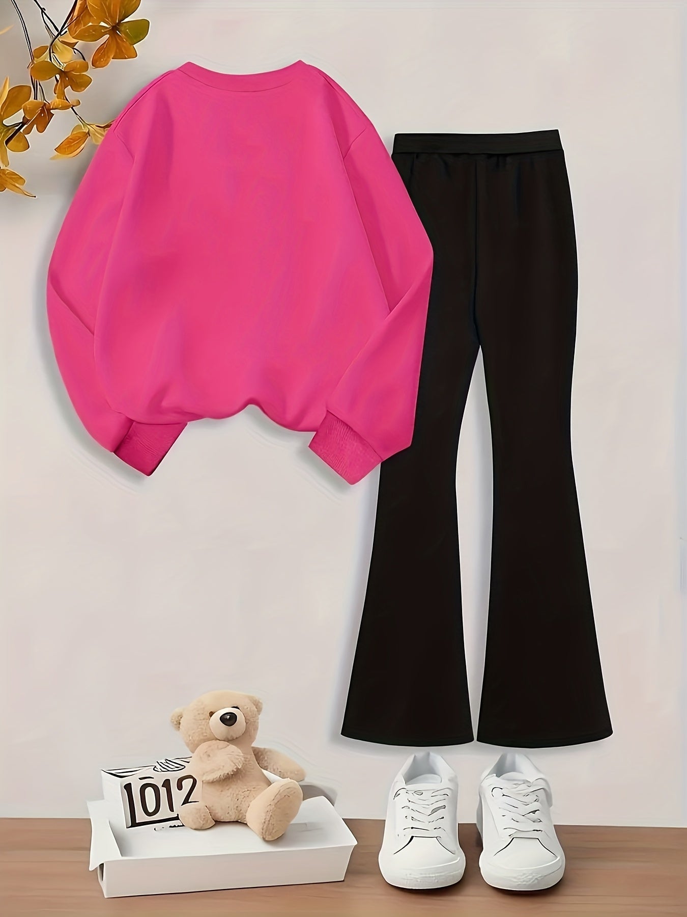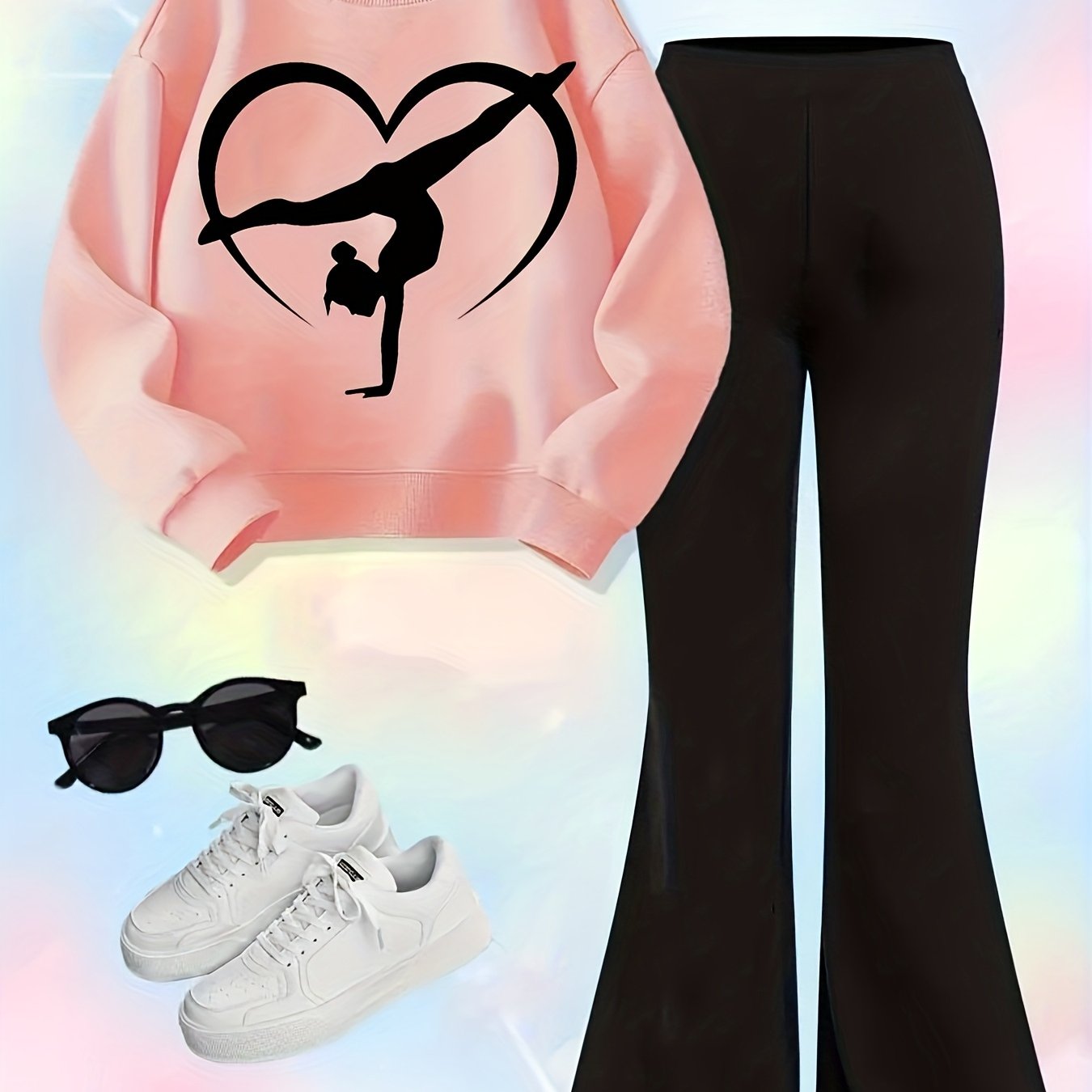 Girls' Gymnastics Dance Outfit Set - Heart Gymnast & Flared Pants with Handstand Pose Decor, Beige/Black/ Pink/Black/White/Gray/, Soft Light Beige-Friendly Fabric for K-POP Dance Practice, Gymnastics Performances, Casual Atti