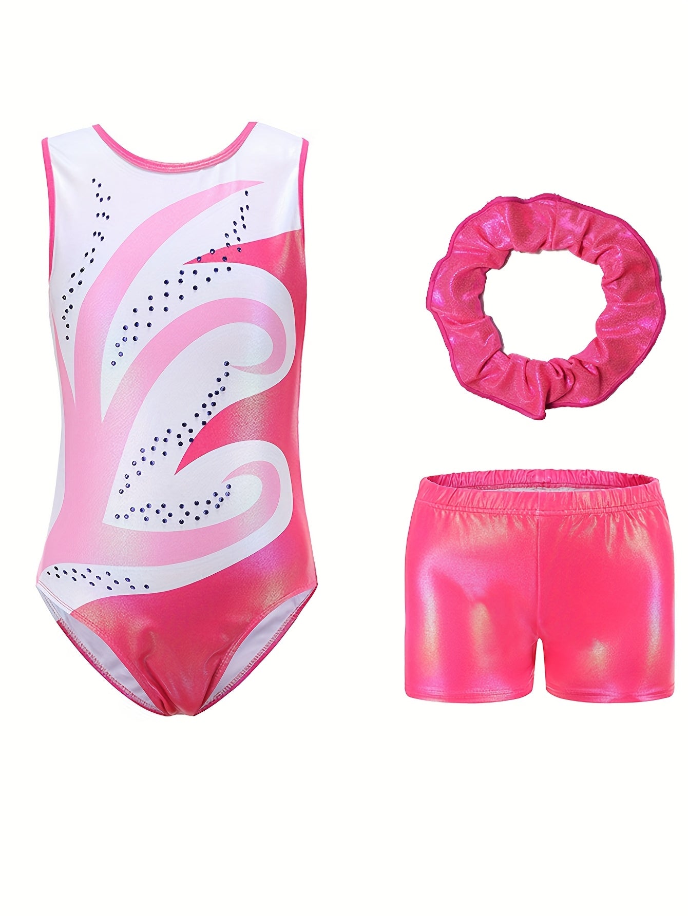 Girls' Sleeveless Gymnastics Leotard with Sparkling Blue & Purple Swirl Design + Light Blue Shorts & Hair Tie - Breathable Stretchy Fabric for Dance, Gymnastics, Christmas Parties, Gymnastics Attire, Sleek Fitted Design, Medi