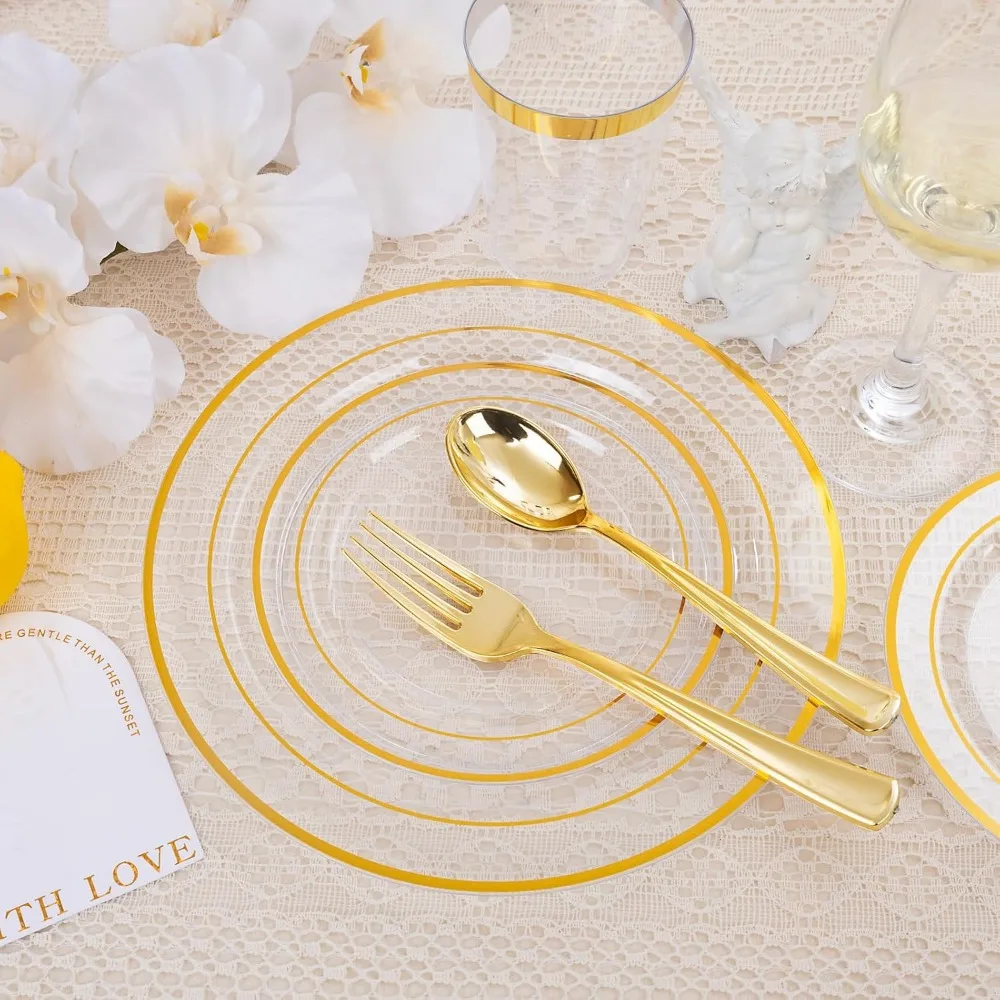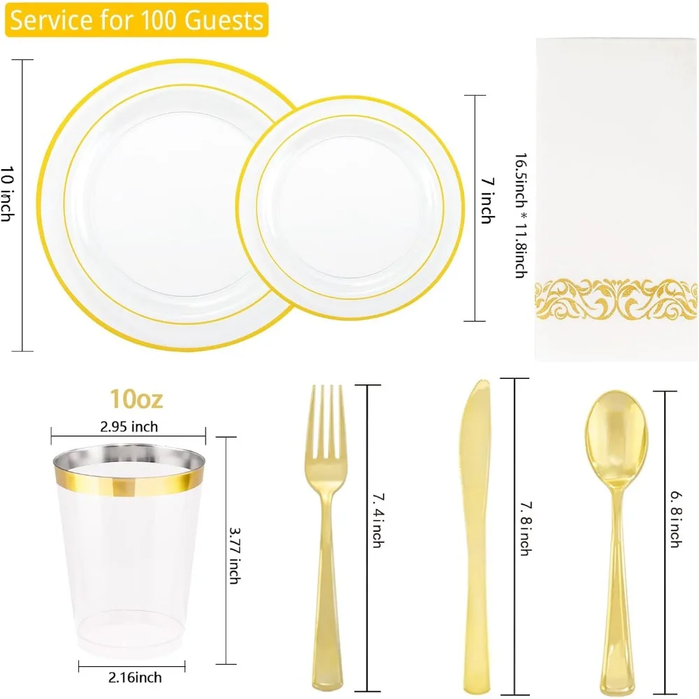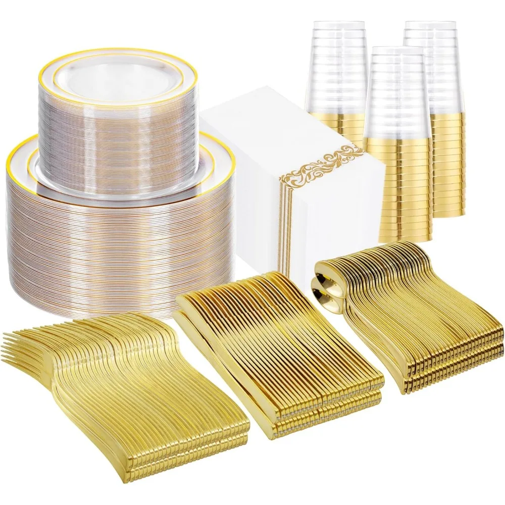 Gold Themed Disposable Dinnerware Set For 100 Guests With 700 Pieces And Clear Plates For Parties And Weddings