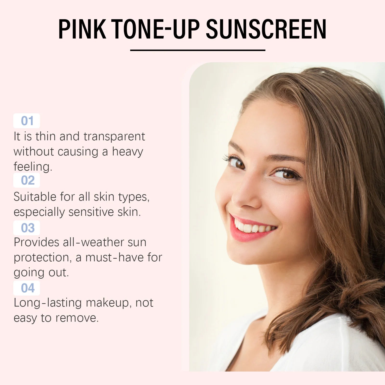 1. Clear quality: This light and transparent spf50+ sunscreen lotion can be quickly absorbed, moisturized lightly, with delicate texture, moisturized smoothly, light and non-greasy, easy to apply, and can provide excellent sunscreen protection for your skin.