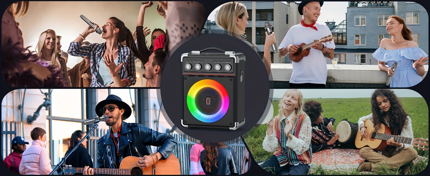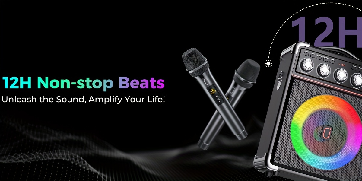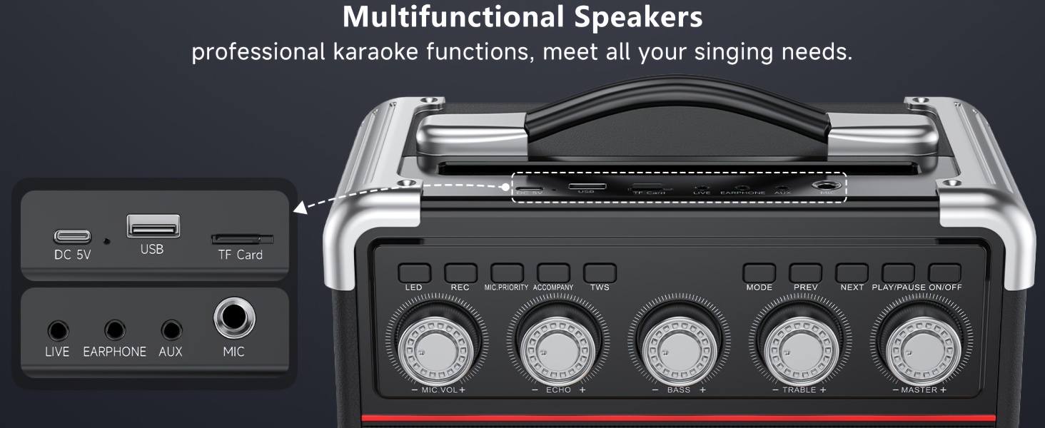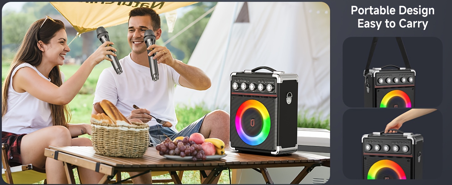 Portable karaoke machine with 2 microphone, battery, long-lasting playing time, always ready for party. Let's get one for Halloween ,Christmas, Gathering and Party.