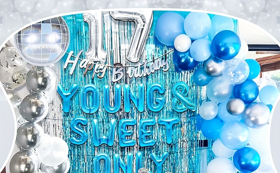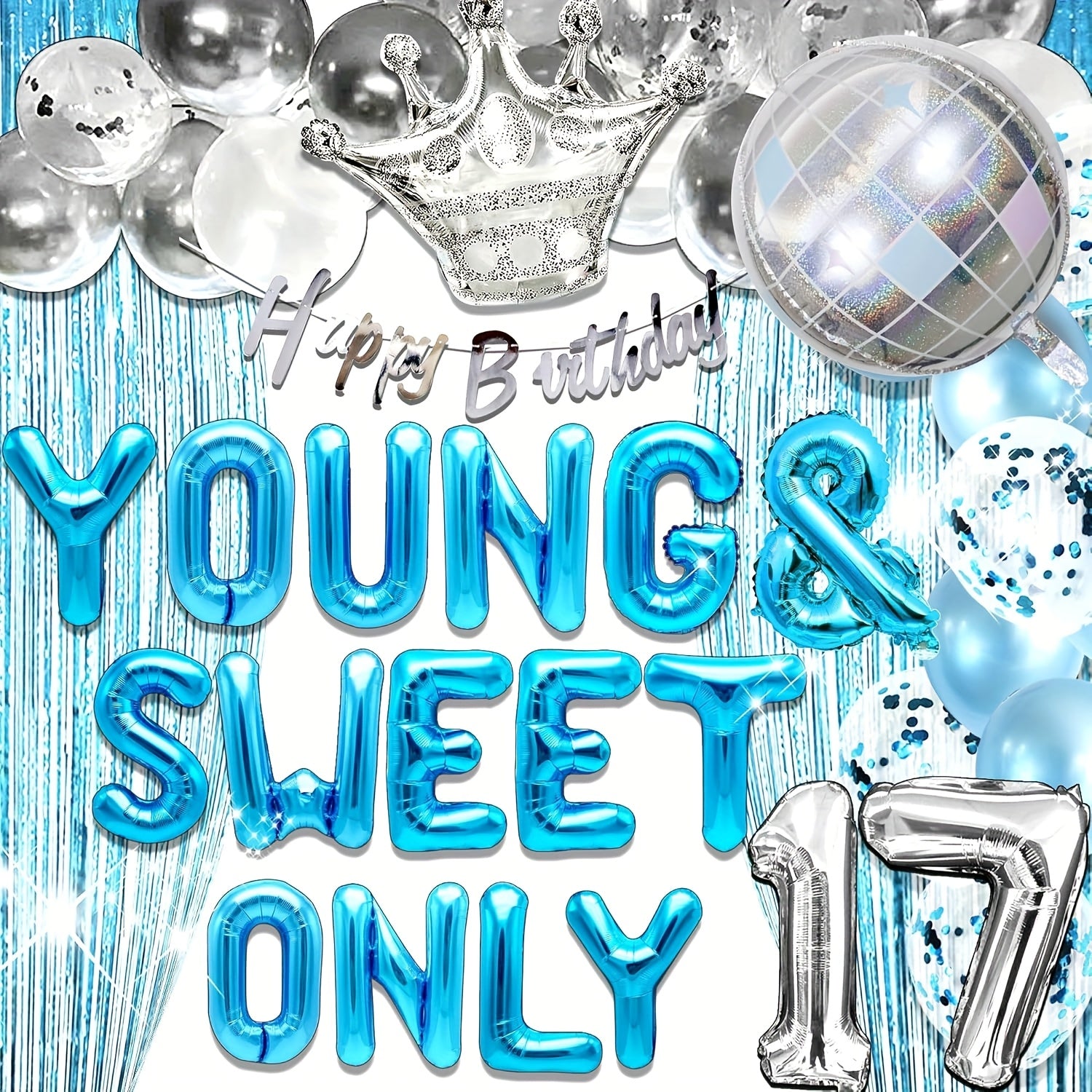 LaVenty 26pcs Silvery Blue Youthful and Sweet Birthday Decorations, Youthful and Sweet Banner with Dancing Queen, Disco Balloons in Rose Golden, Birthday Banner with Crown Queen Balloons
