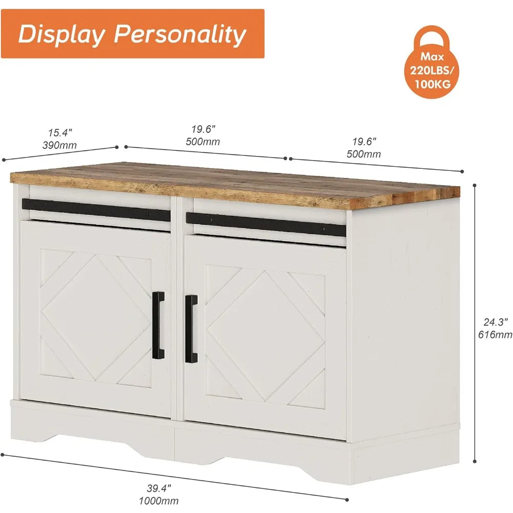 - Durable engineered wood construction with a real wood grain surface in a creamy white finish and a barn-door design that adds rustic charm to your space.