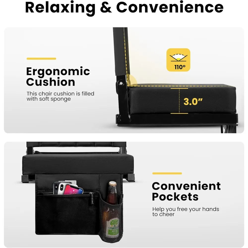 - Relaxing comfort and versatile use: 3.9-inch thick foam, 110-degree tilt; backrest and cushion are securely attached; great for sports events, graduations, concerts, and camping.