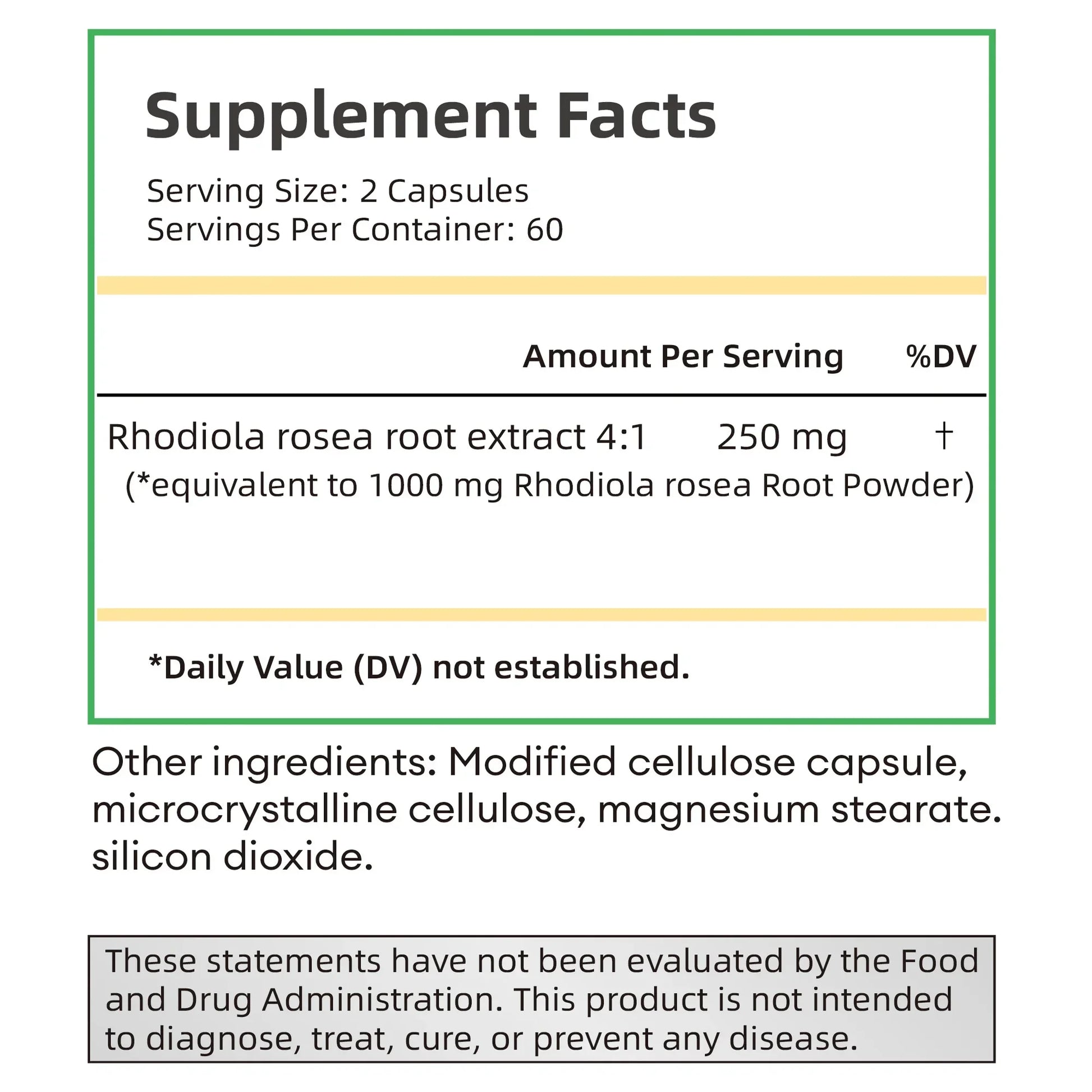 HERBAL SUPPORT: Per Serving capsule provides the equivalent of 1000 mg (from 250 mg of 4:1 extract) of Rhodiola rosea root. It is an adaptogenic herb because it helps the body cope with and adapt to the stresses of everyday life.