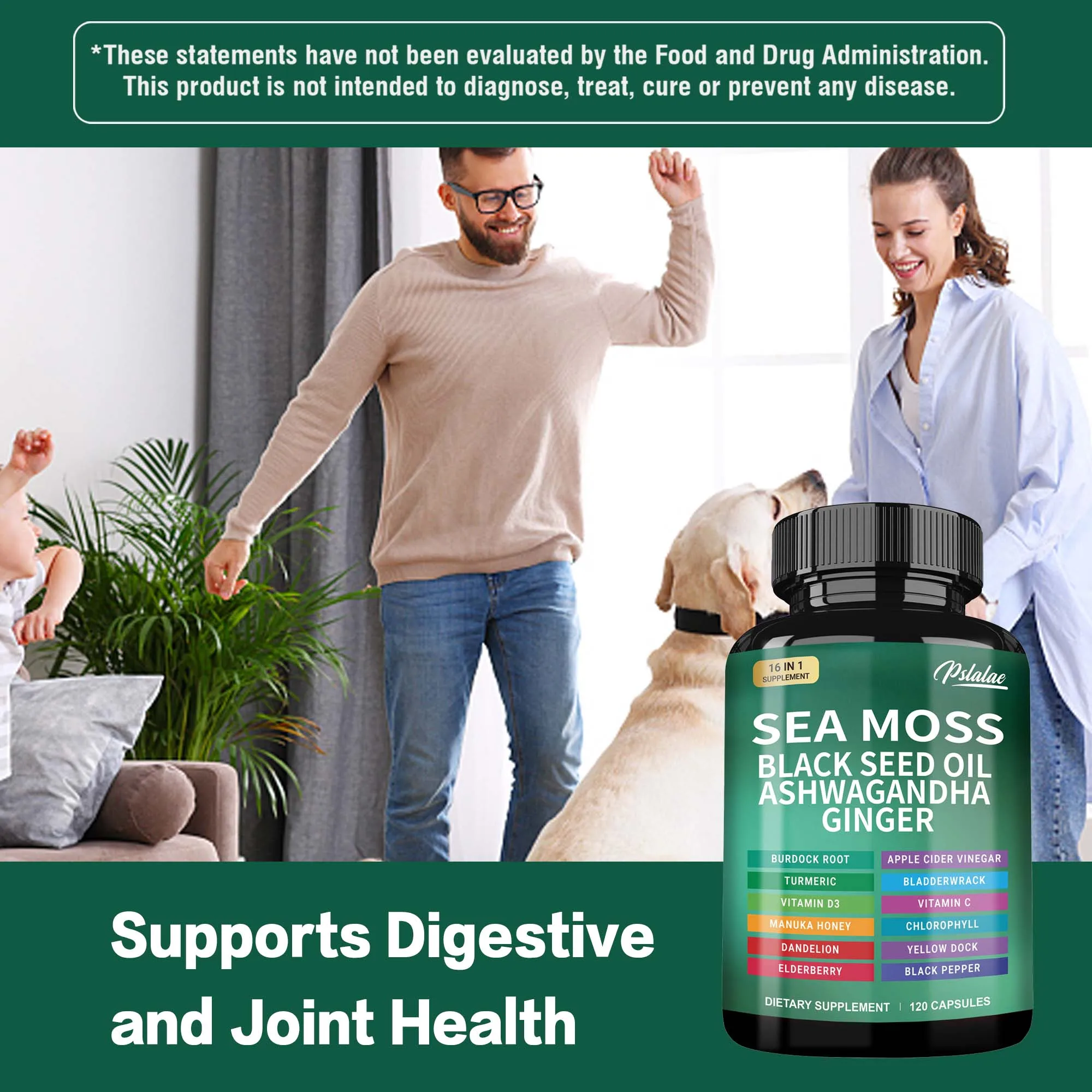 Sea Moss | Black Seed Oil | Ashwagandha | Ginger - Boosts The Immune System, Promotes Digestion and Joint Health | 120 Capsules