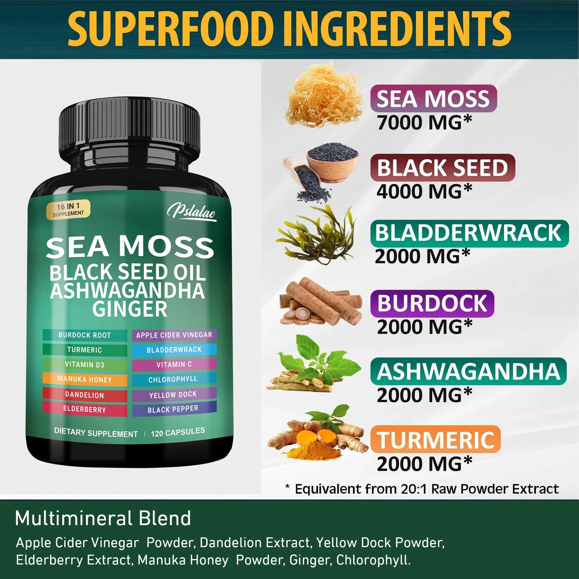 Ingredients: Sea Moss, Black Seed, Ashwagandha, Turmeric, Bladderwrack, Burdock