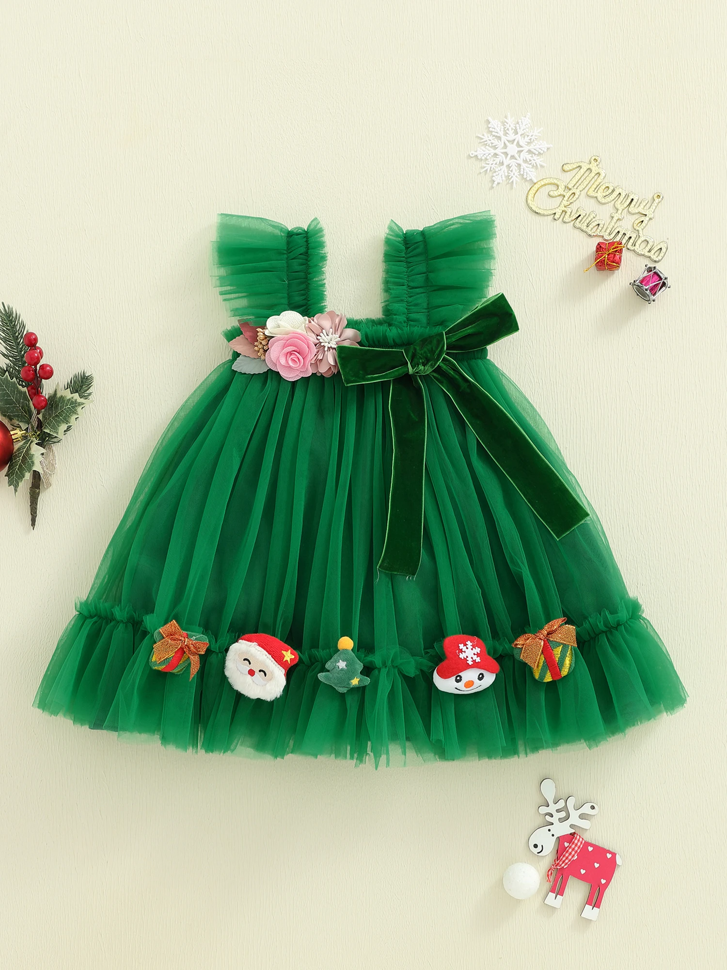 Turn every holiday moment into a twirl-worthy memory with this Toddler Girl Holiday Tulle Dress, featuring 3D flowers and a festive Santa bow that sparkles in every photo.