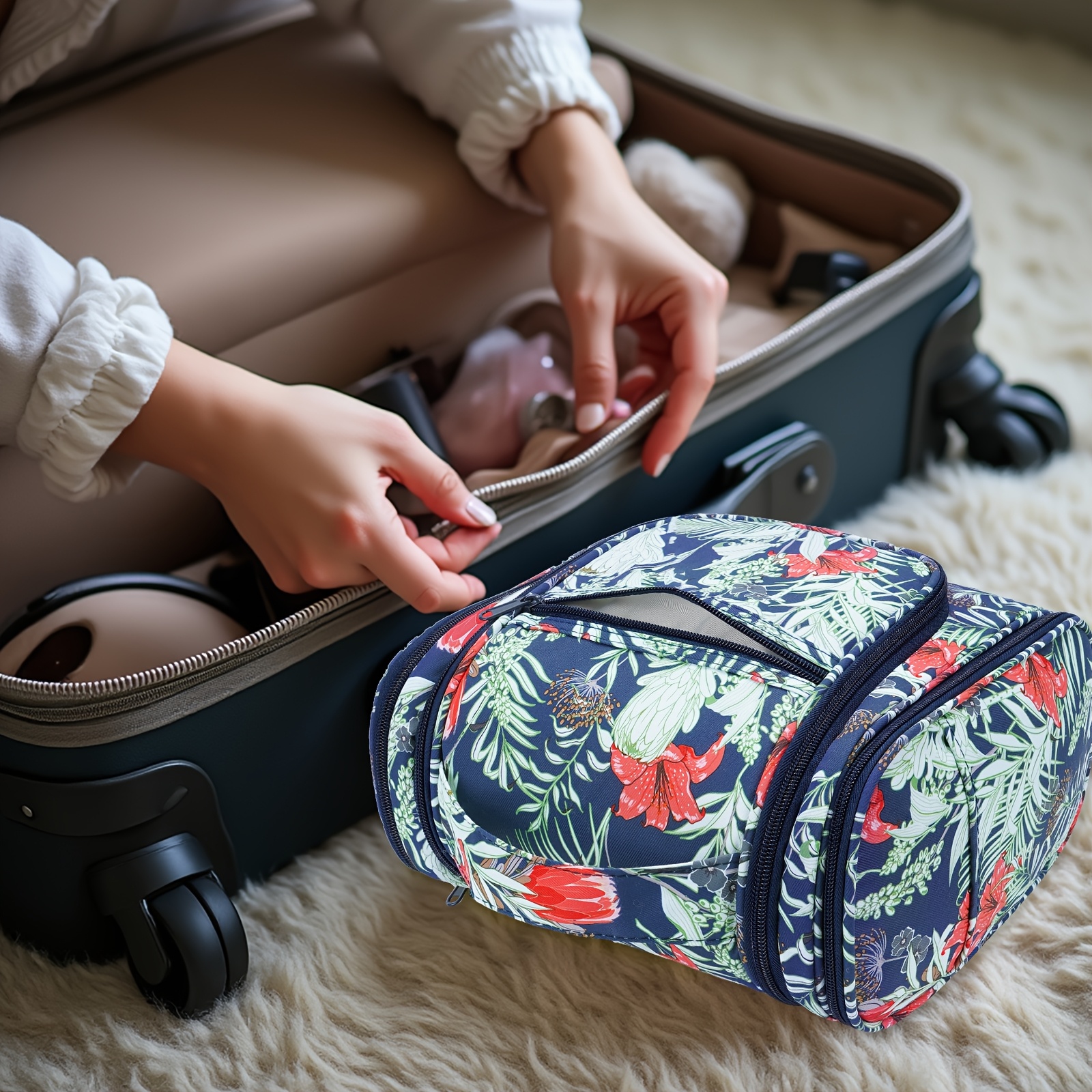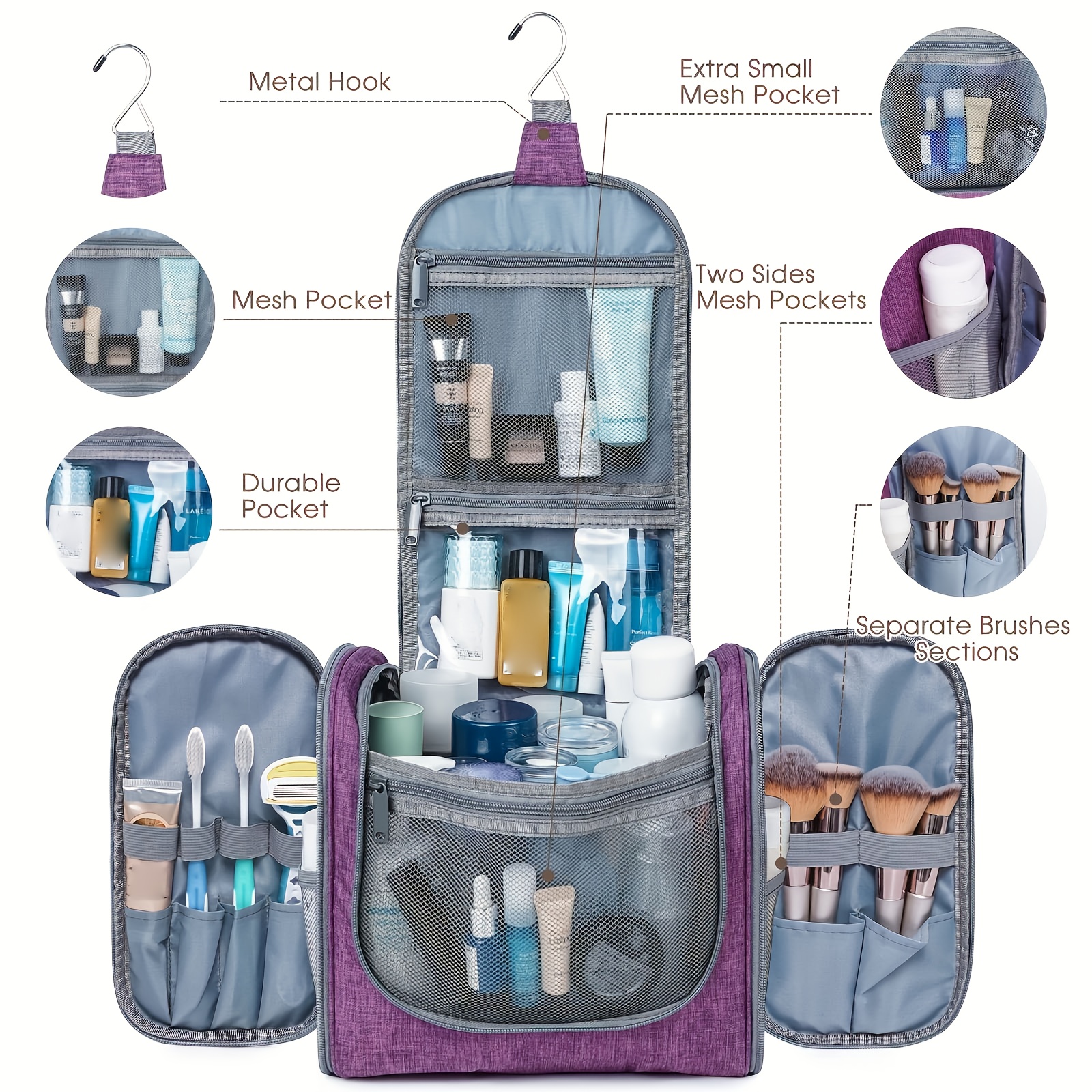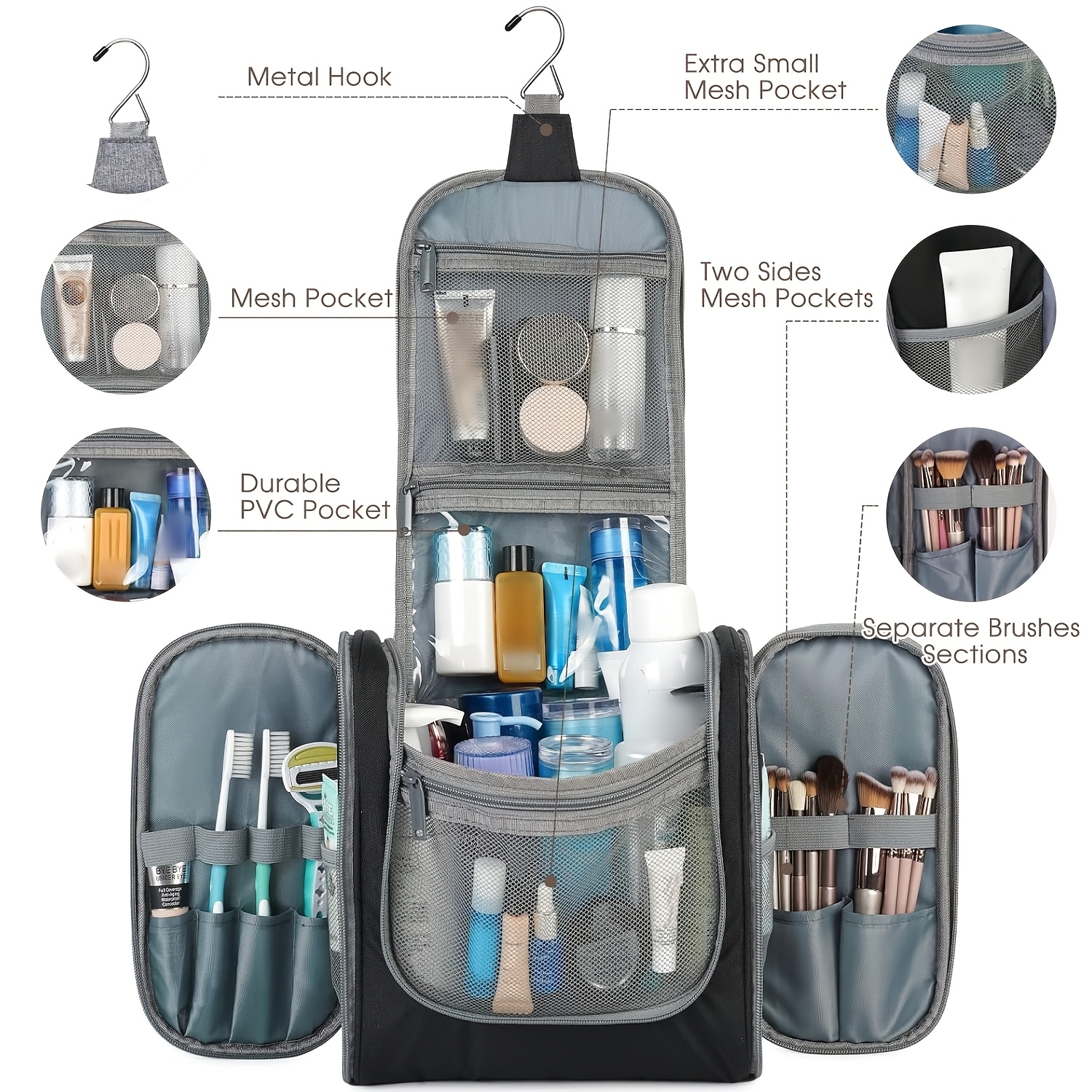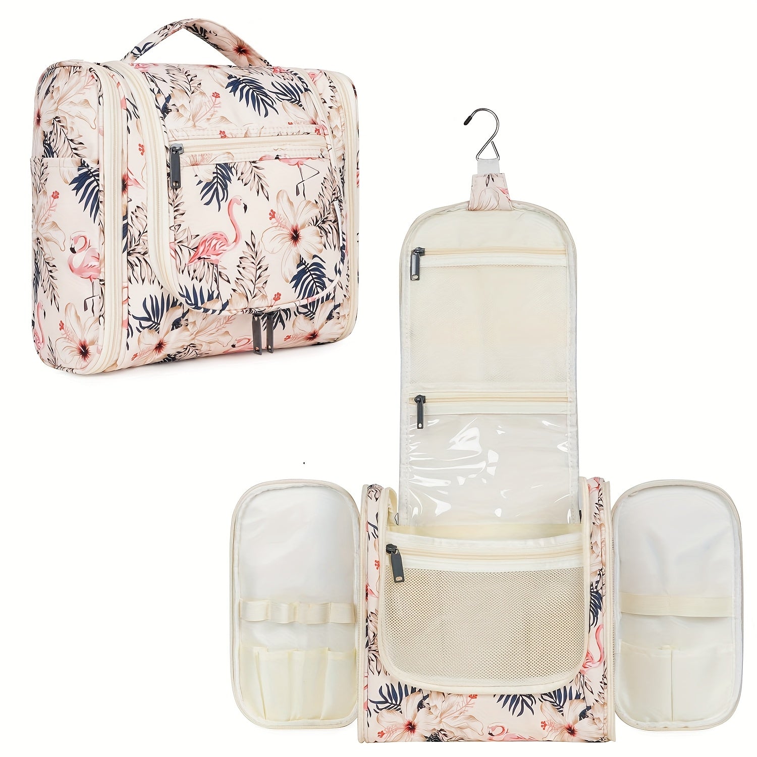 DETAILS ORIENTED - Buit-in large metal hook allows hanging the toiletry case from towel rack, coat hook or whereever is available
