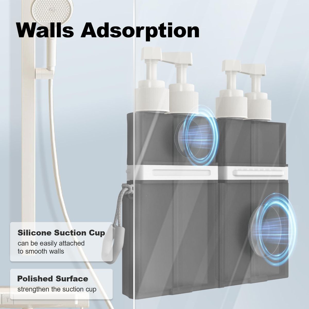 YOTIME 4in1 Travel Bottles Set, Vacuum Suction Cup for Smooth Walls, TSA Approved Leak Proof Travel Size Containers for Toiletries, Shampoo, Body Wash and Conditioner, Gray, Travel Toiletry Containers, Toiletry Organization,